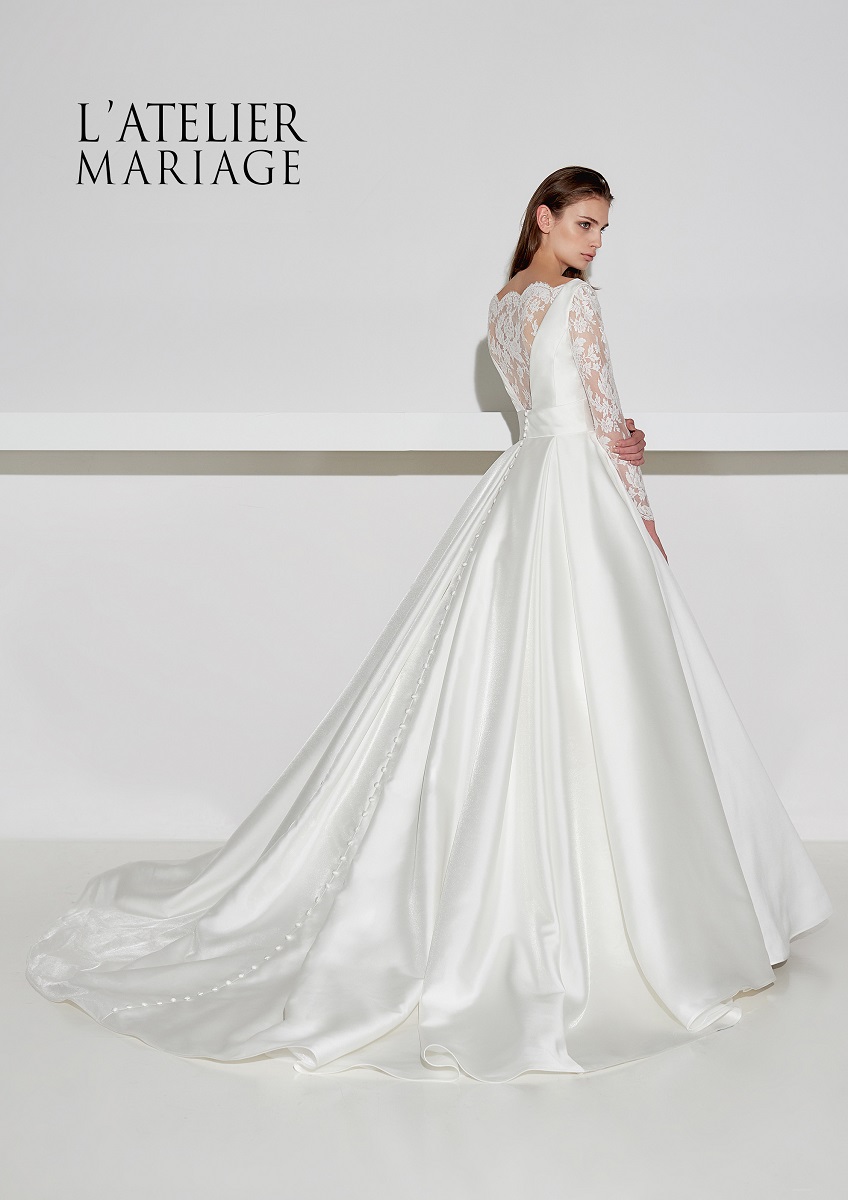 クラシックな装いにも変化するモダン大柄レースの背中あてと長袖で3WAYの着こなしが叶うウェディングドレスです。