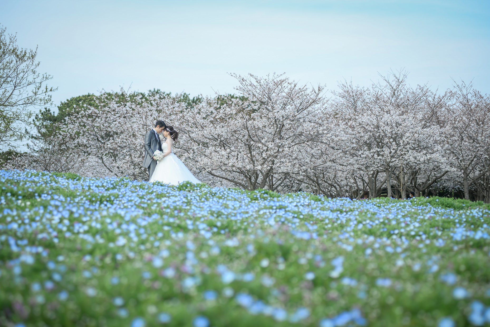 優しい桜のピンクとネモフィラと空のアクアブルーで幻想的な写真になります。