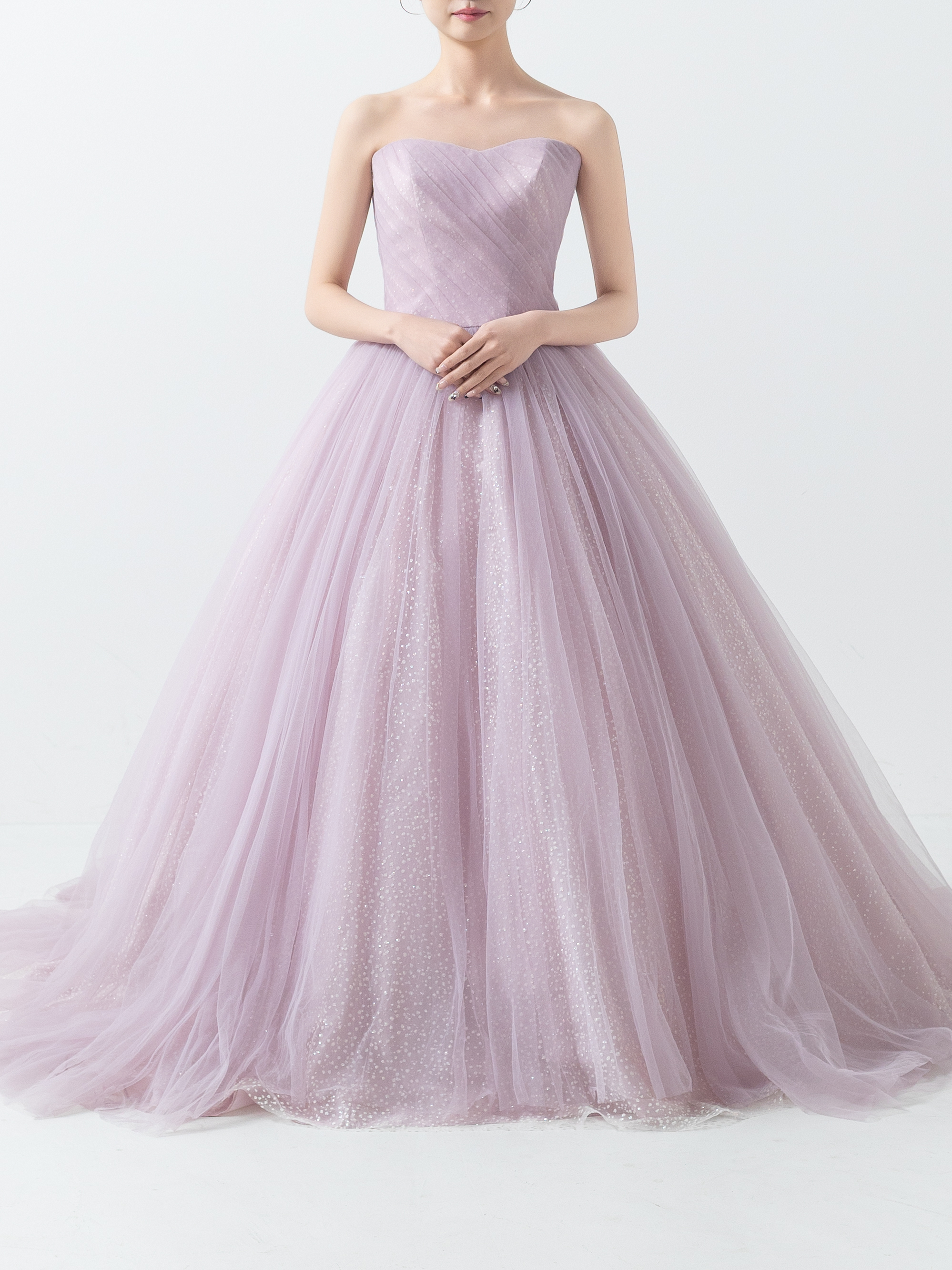 きらめきを放つグリッターと、重ねられたチュールが美しく上品なデザインになっています。スリーブ取り外しも可能となっています。
