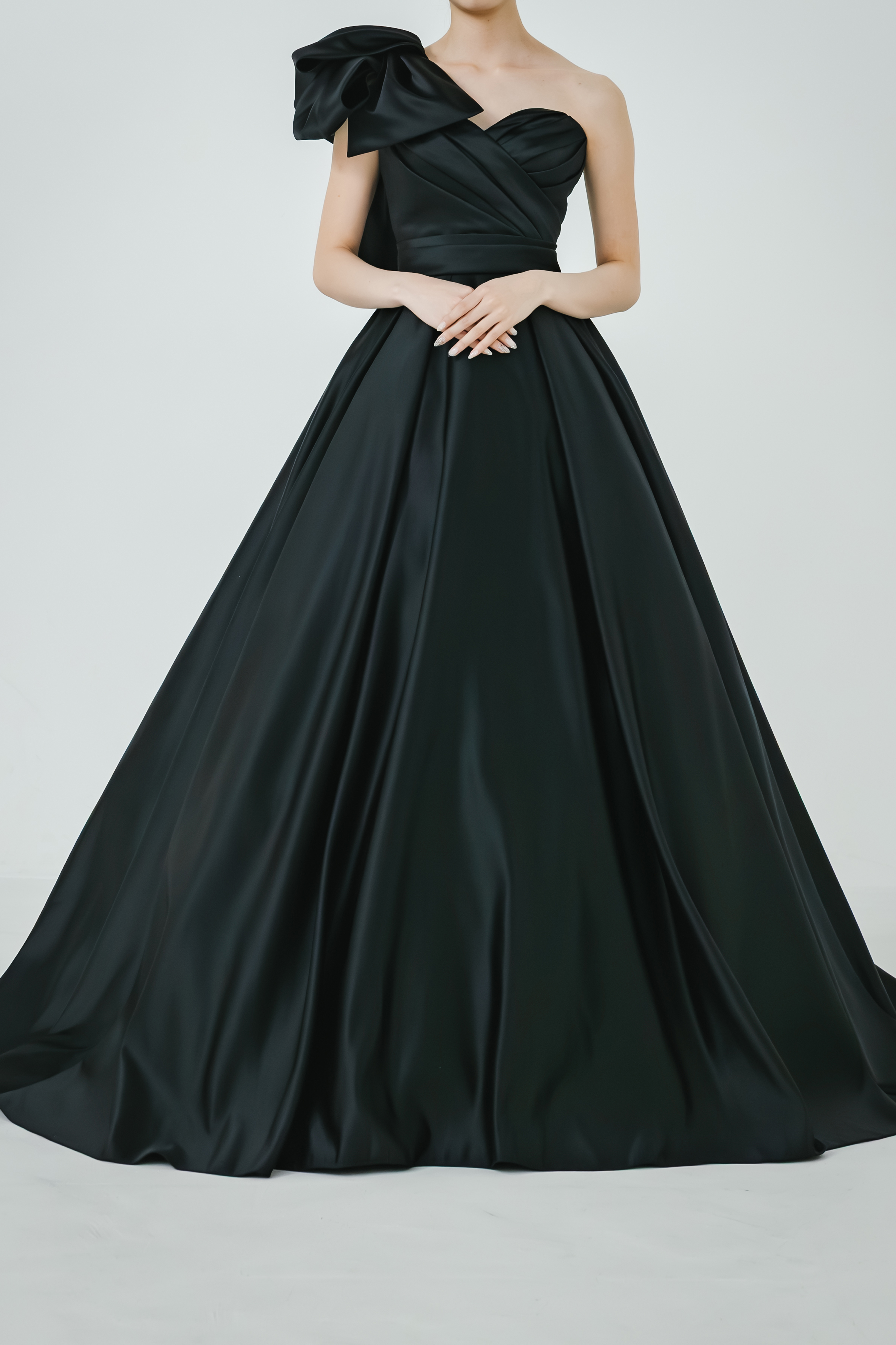 艶やかな光沢と重厚感のある素材が高級感のある1着。最新トレンドのビックリボンワンショルダーでモードにきこなせ、取り外すと美しいドレープが目を惹く1着