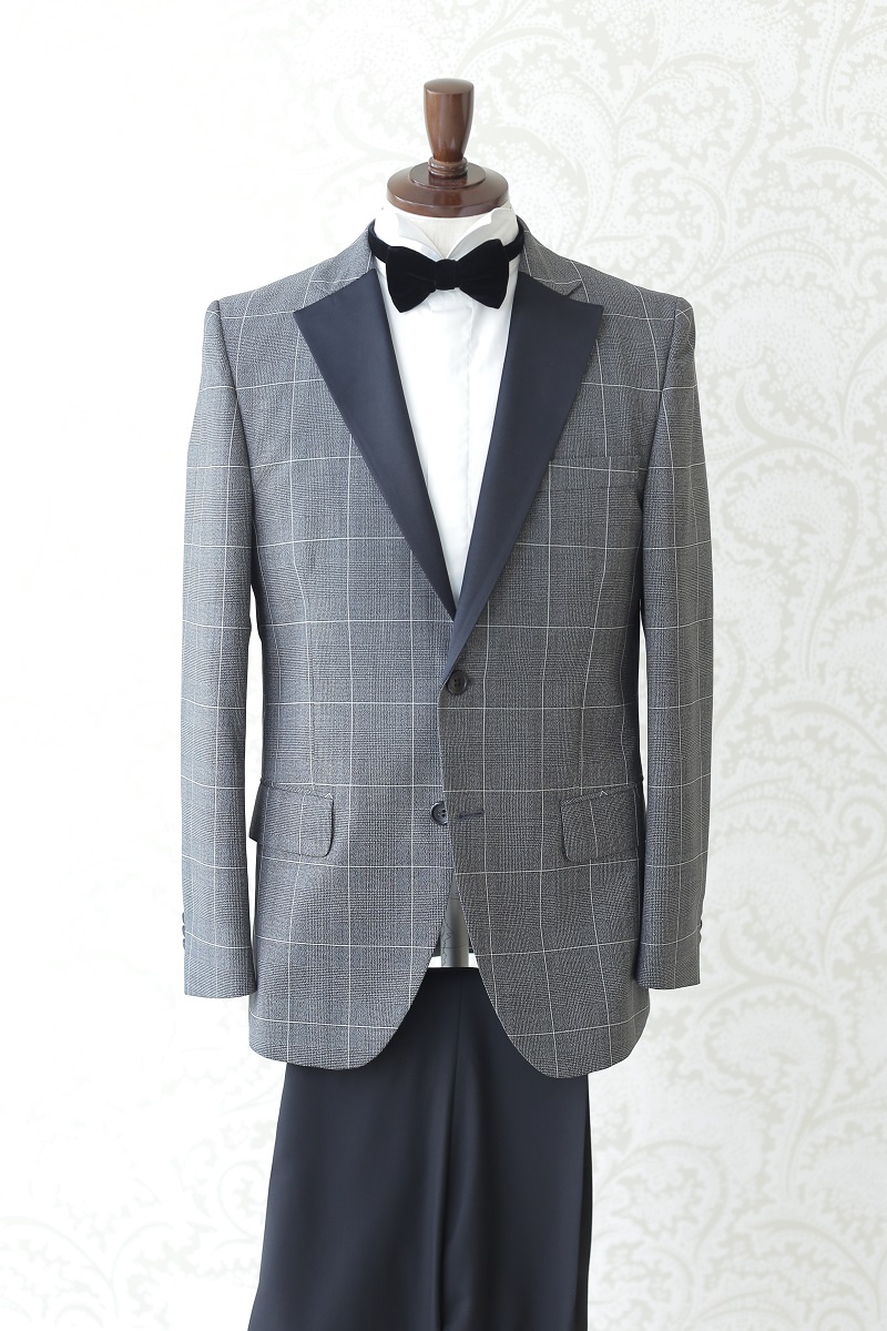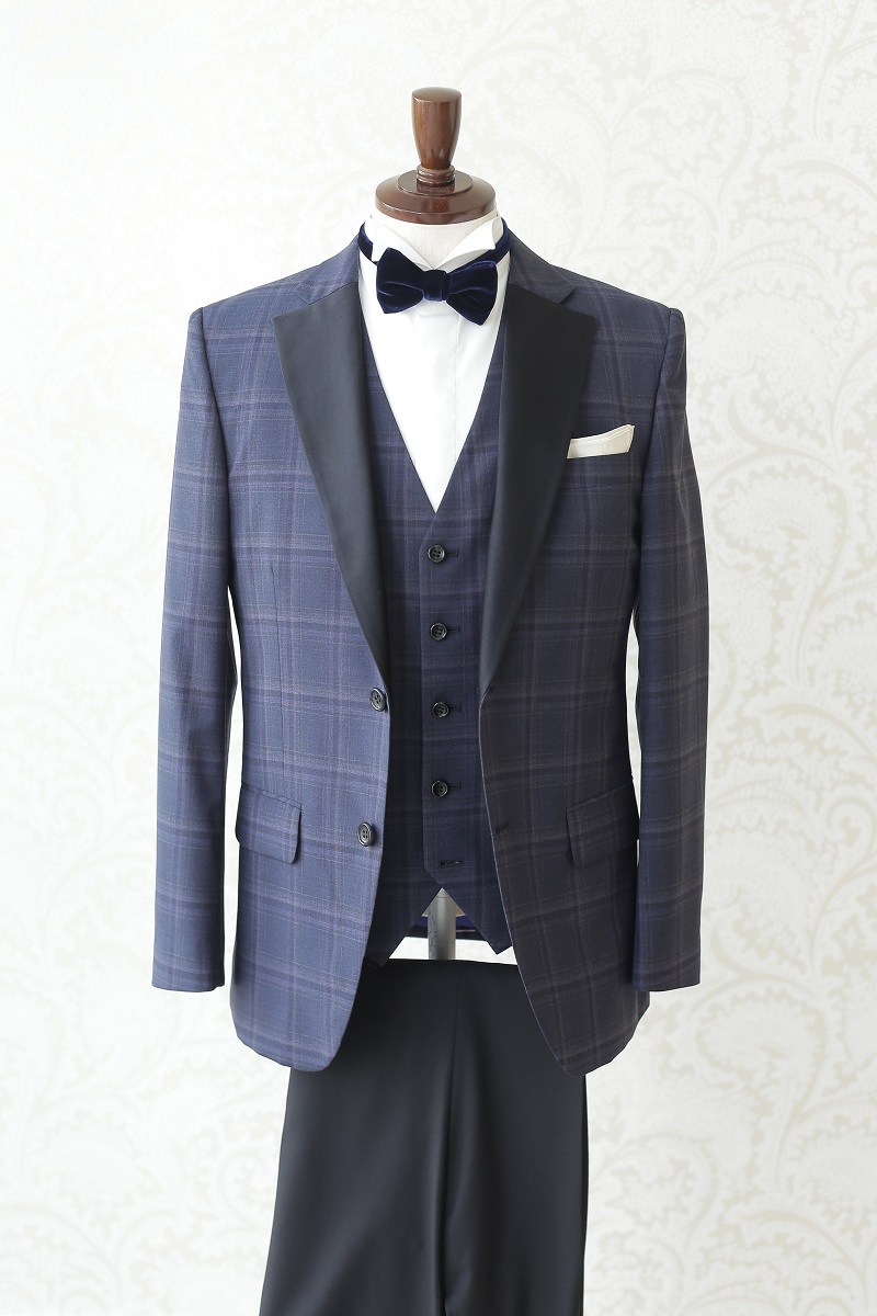 Lazy Cinderellaオリジナルタキシード。イタリアを代表する名門服地メーカー「REDA」の生地を使用した大人チェック柄のネイビータキシード。