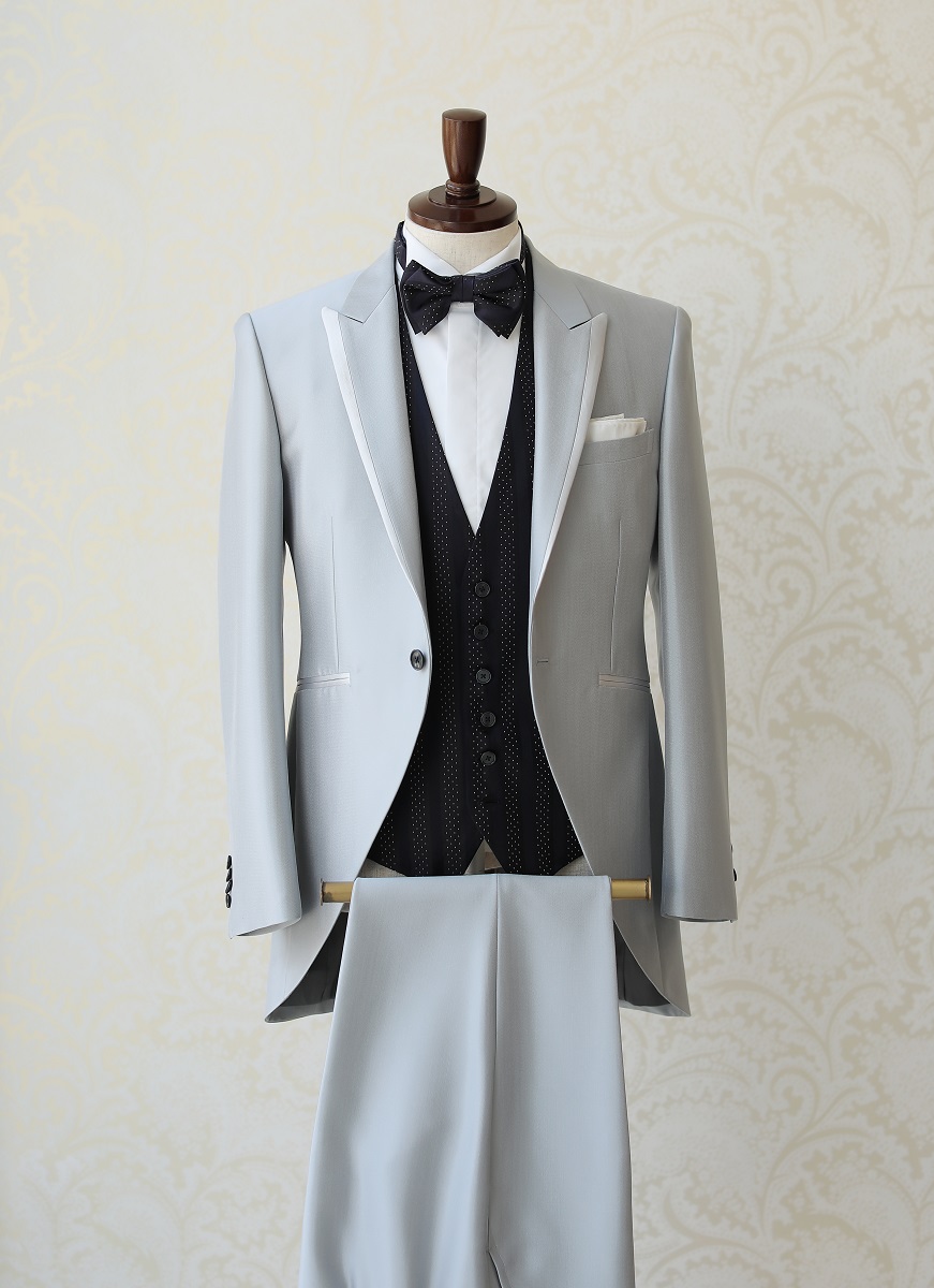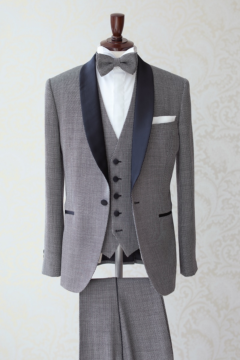 落ち着きのあるシルバータキシードに、細かいドット柄のベストと蝶ネクタイが素敵な一着。