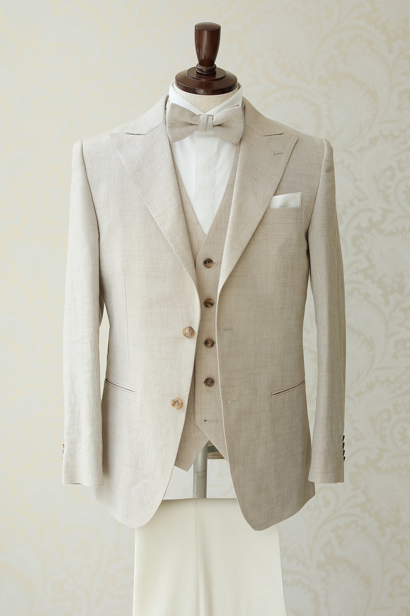 ベージュ色に統一されたタキシードは新婦様のドレスの色に合わせやすくトータルコーディネートを楽しめる1着です。