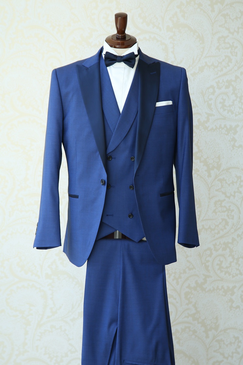 Lazy Cinderellaオリジナルタキシード。DORMEUIL EXELの生地を使用した爽やかなブルータキシード。ダブルブレストのベストが印象的な一着。