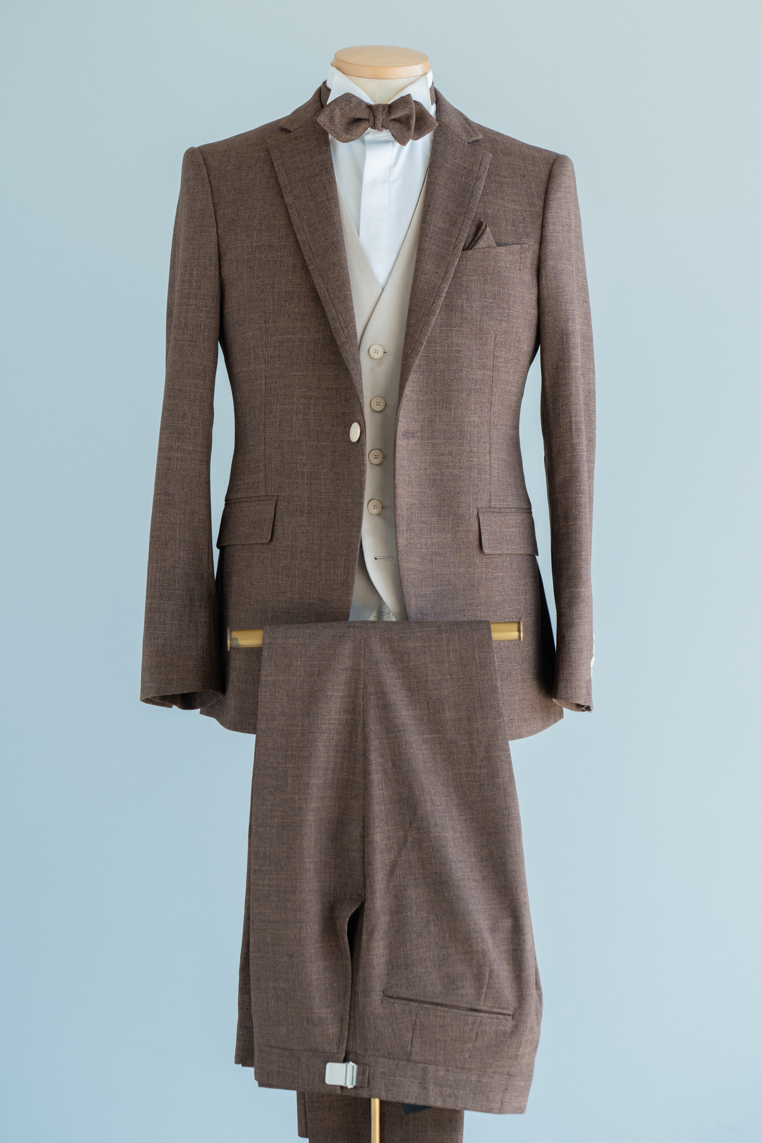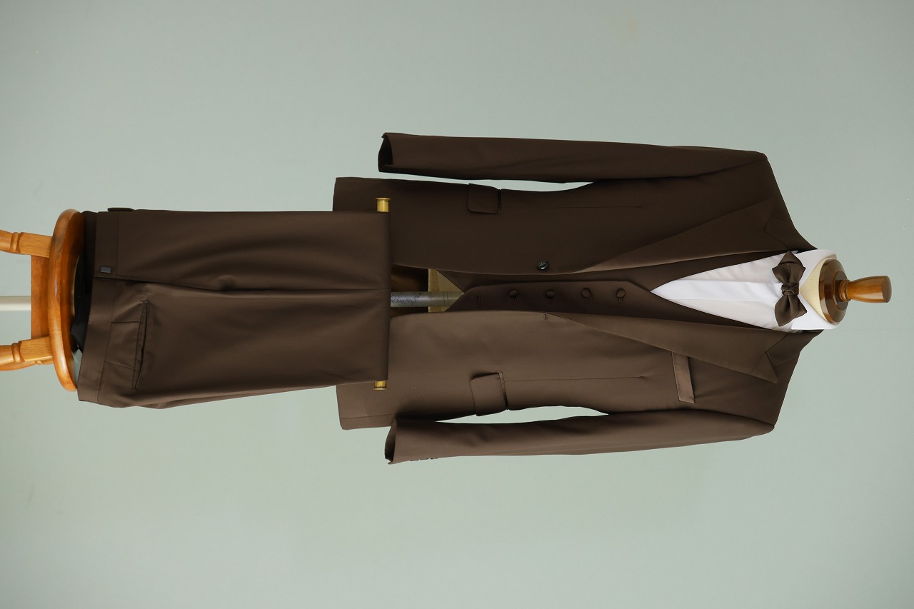 ジャケット・パンツ・ジレの組み合わせが自由なLazy Cinderellaオリジナルタキシード。SCABALの生地を使用した大人ブラウンタキシード。