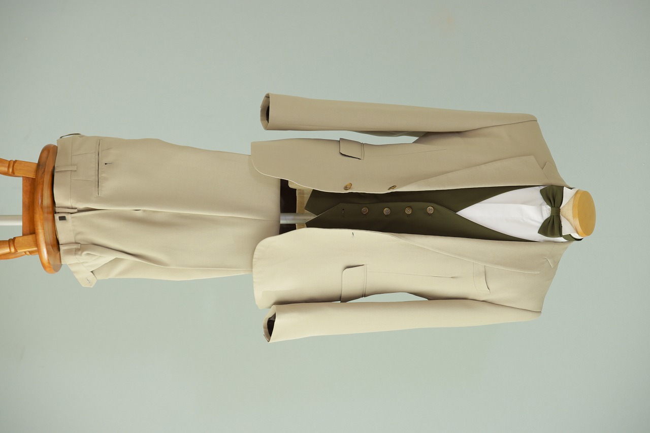 ベージュの爽やかな色味にカーキのベストとタイがポイントの1着