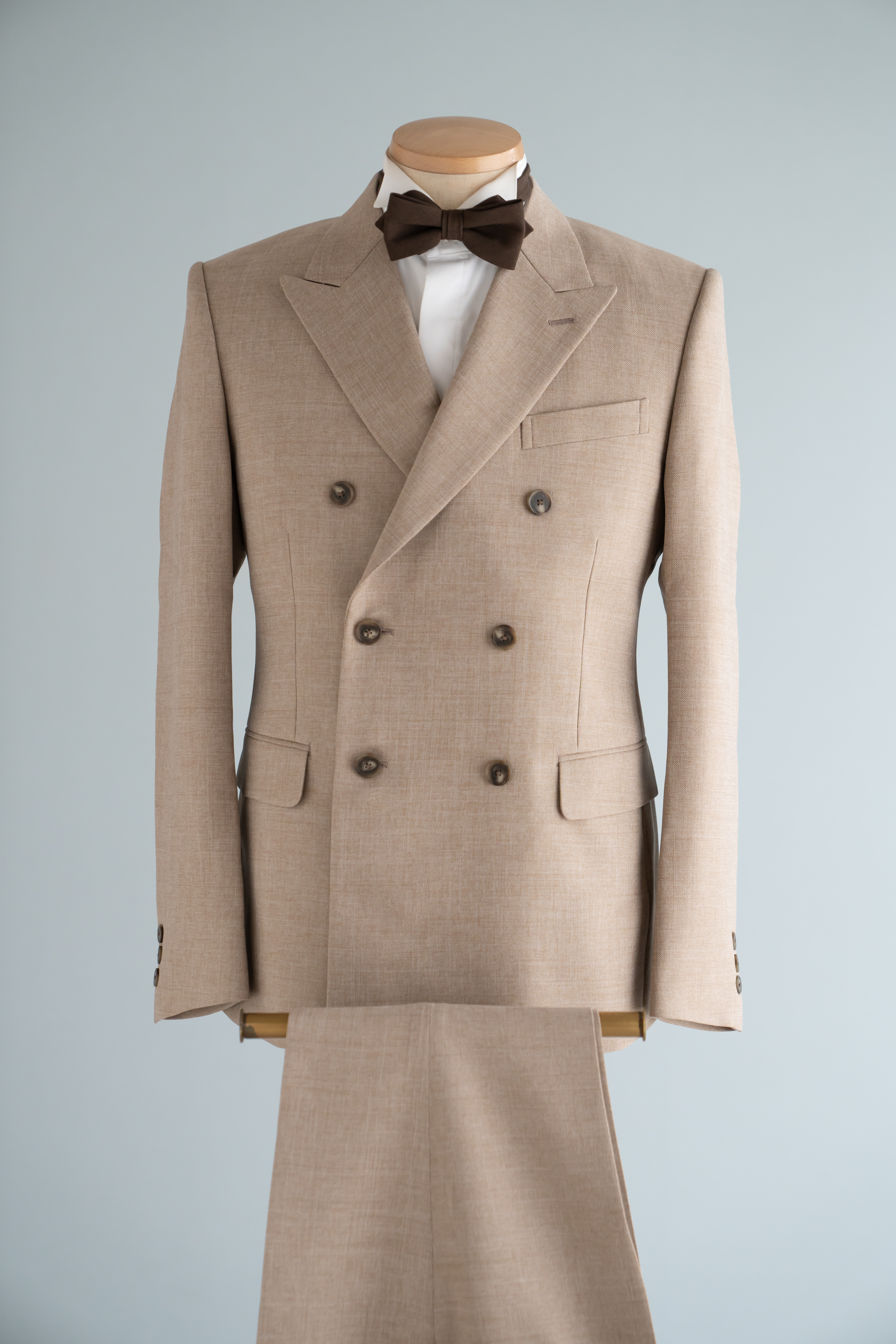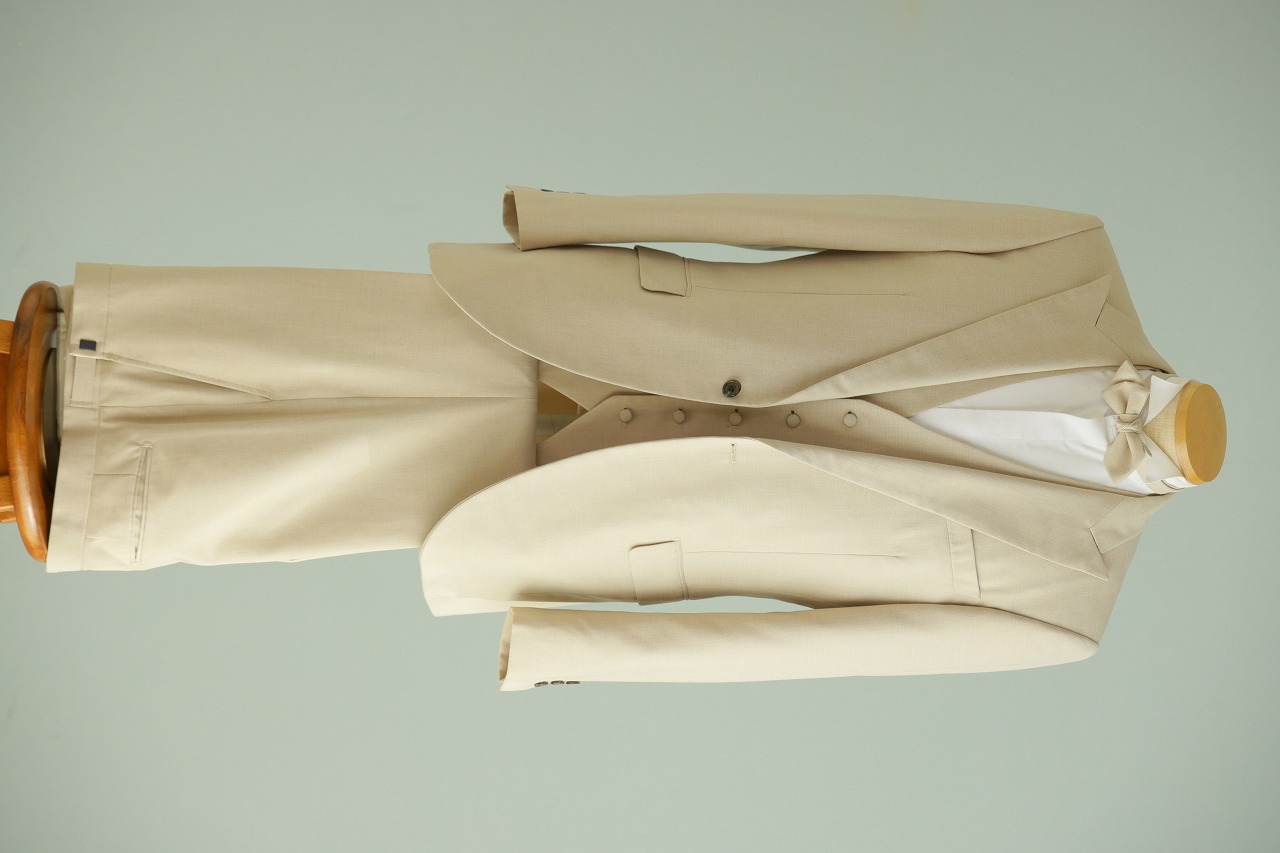 ベージュカラーのダブルタキシード。ダブルのデザインは今期のトレンドな1着です。