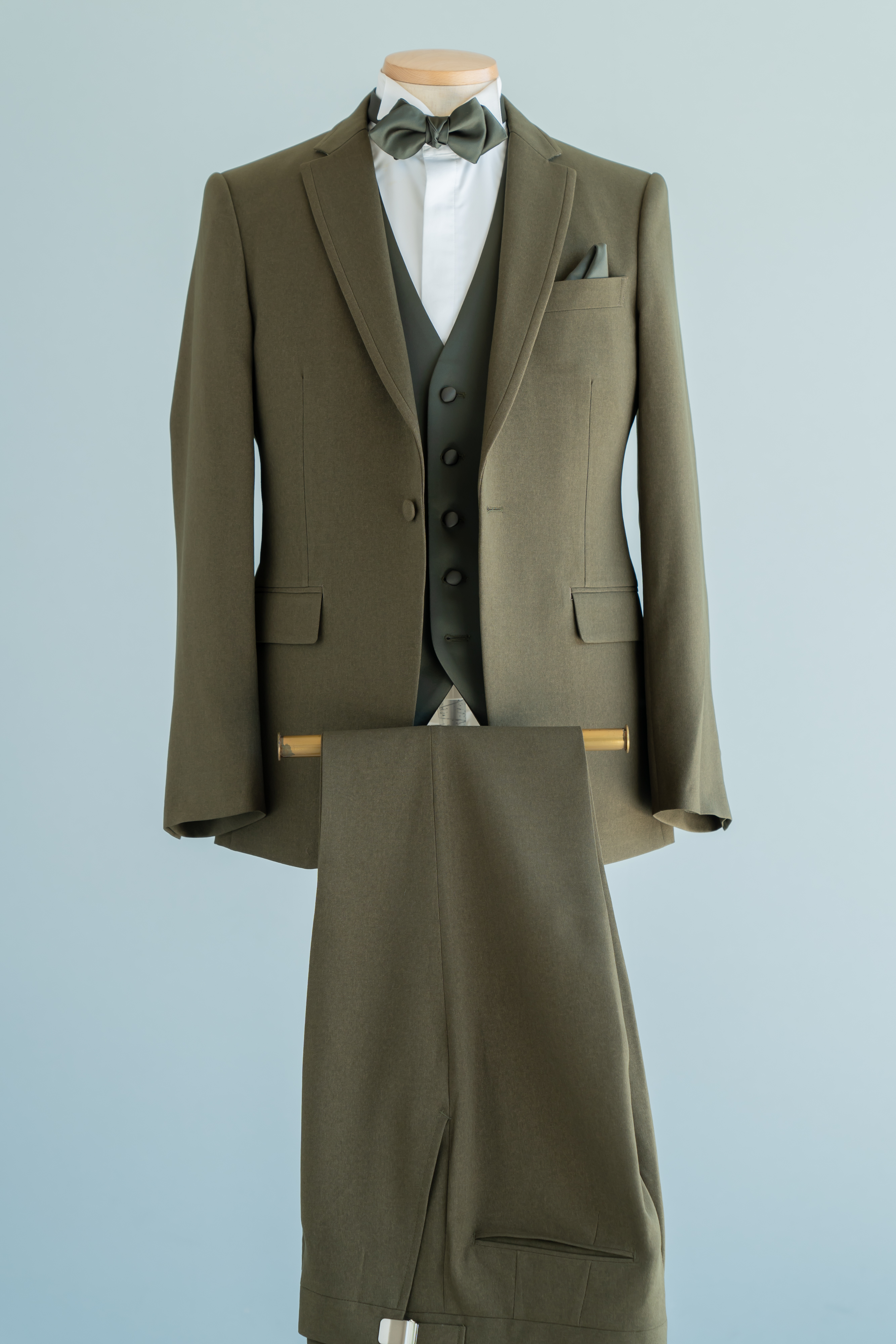 オリーブカーキのトレンドなカラータキシード。ベストと蝶ネクタイのサテンがポイントです。