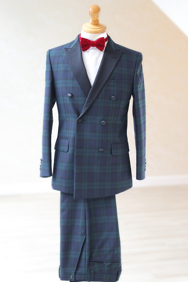 グレー、ネイビー、ホワイトなど様々なカラーで彩られた、チェック柄のタキシード。主張しすぎない、絶妙なカラーバランスが大人の雰囲気を作り出しています。艶のあるゴールドの蝶ネクタイが華やかさをアップ。
