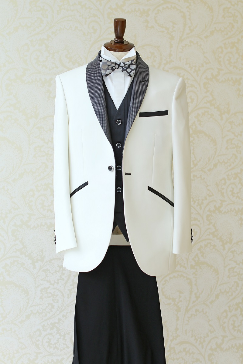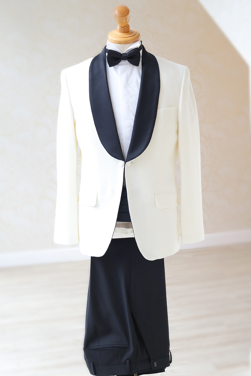 ジャケットとパンツのバイカラーコーディネートが新鮮なタキシード。