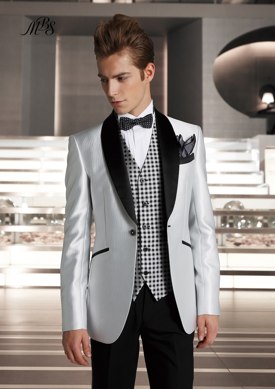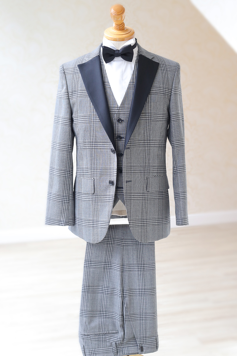 シルバーカラーのジャケットと、ブラックパンツのコンビネーションが美しいショールカラーのタキシードです。ギンガムチェックの存在感あるベストも素敵です。