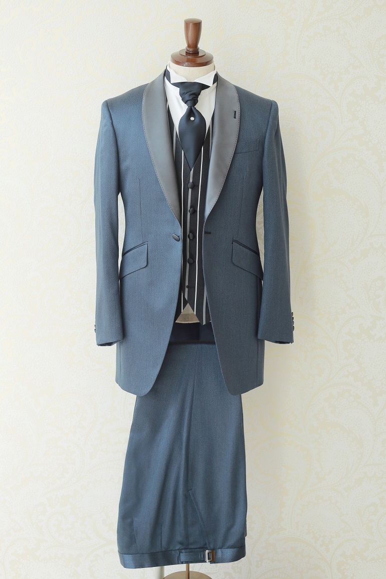 水面のように滑らかな光沢のある上質な素材を使用し、仕立てたモダンなモーニング。ジャケットのフロントからバックへの流れるような曲線はもっとも優雅で格式あるデザインとシルエットの証でもあります。
