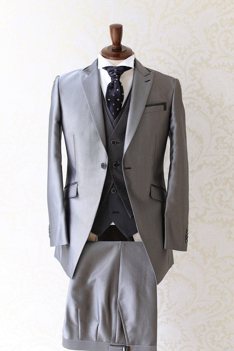 シンプルなシルバータキシードにレイヤードのベストを合わせた一着。