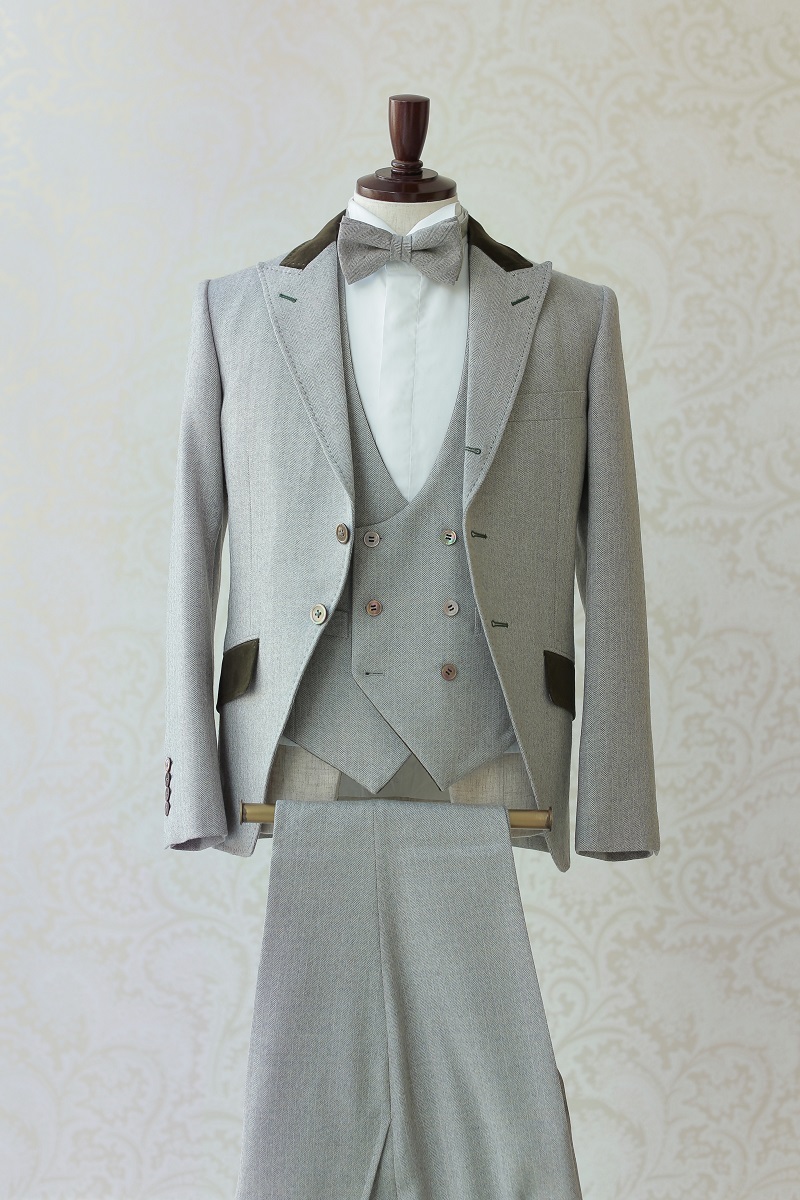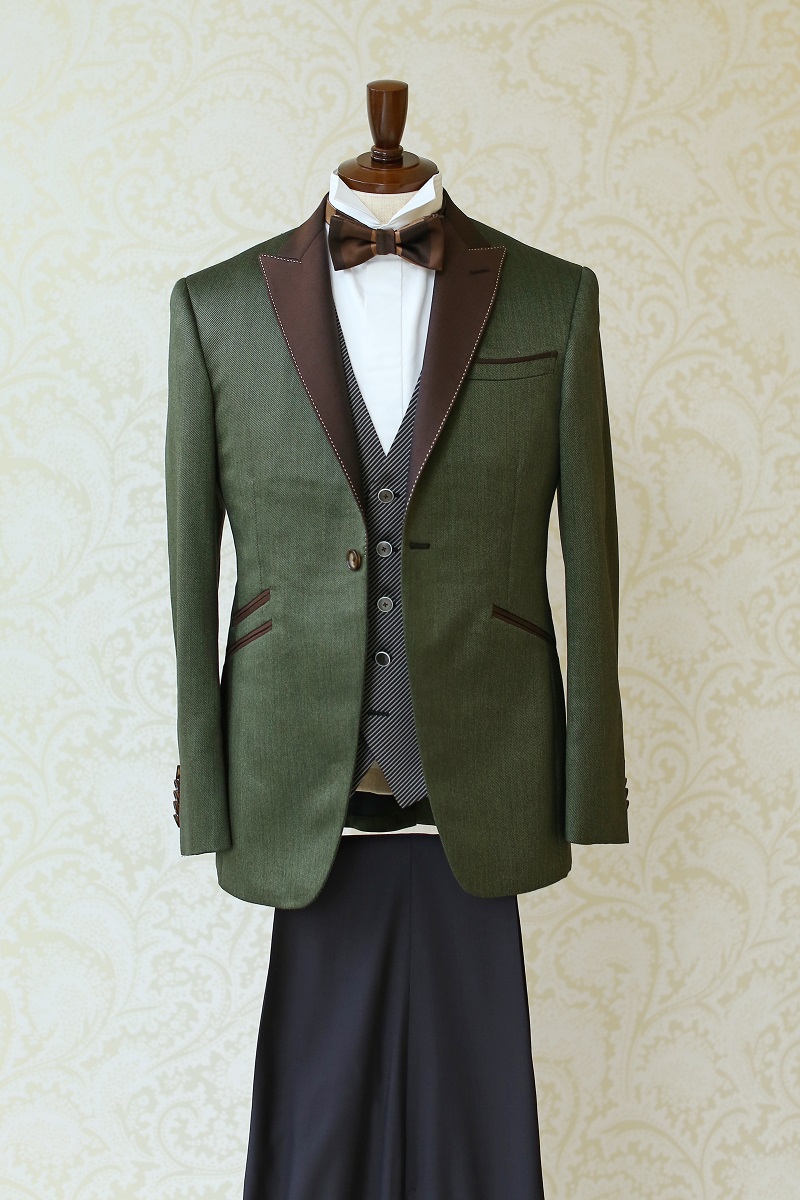 ミックスグリーンのヘリンボーン素材を使用したモーニング風タキシード。ジャケットは、ピークドラペルにモーニングカット風にカッティングされたフロントカット、トラディショナルな3ツ釦段返りスタイル。上衿とフラップにはモスグリーンのベルベットを使用。ハンドステッチとボタンホールにもグリーンを配し、ブリティッシュテイスト溢れる一着。
