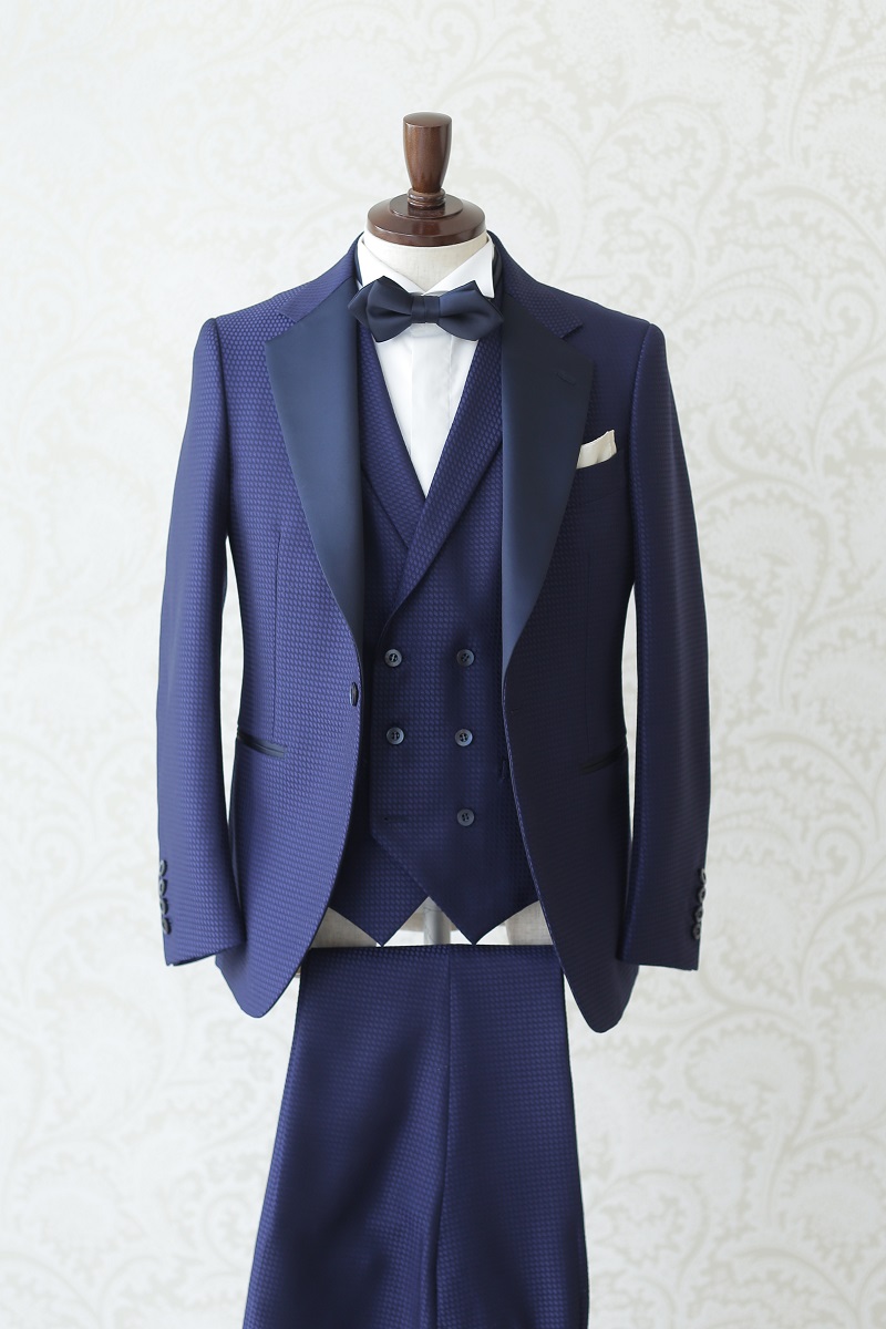 ダブルブレストのジレがクラシカルな印象のネイビータキシード。