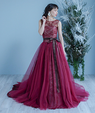 ワインレッドレースの上にチュールが施され動く度にレースが見える上品な1着。好みに合わせてボレロも取り外せます。