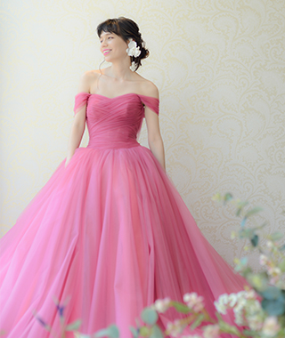 トップスはチュールを巻き付けたようなスッキリとしたデザイン。きゅっと締まったウエストからボリュームたっぷりのチュールスカートが広がる1着。