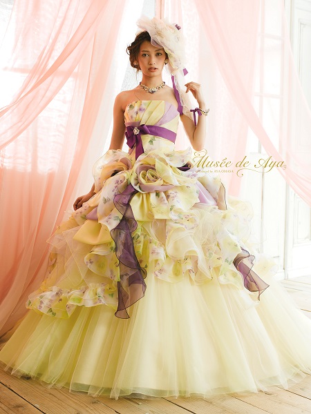 オリジナル柄のプリントサテンオーガンジーにイエロー×パープルのカラーが新鮮な一着。