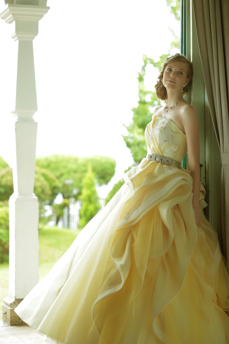 今人気のパステルカラーのイエロードレス、ビジューベルトがアクセントなエレガントなウェディングドレスなどが入荷しています!