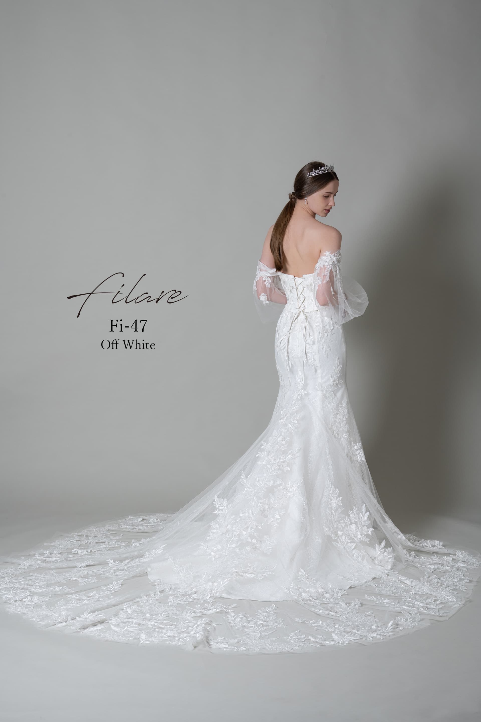 肩を優しく包むオフショルダーのデザインに、軽やかなチュールスリーブを添えることで、