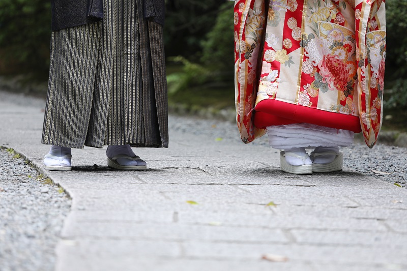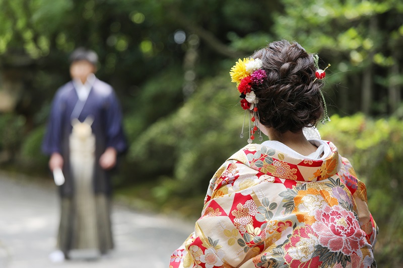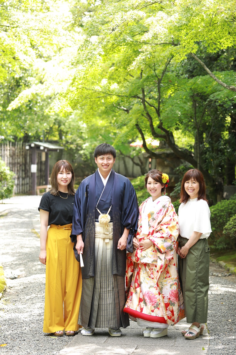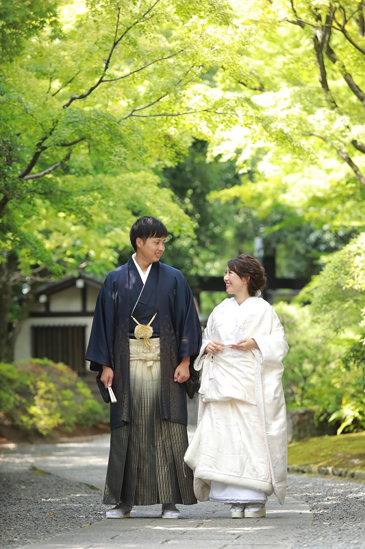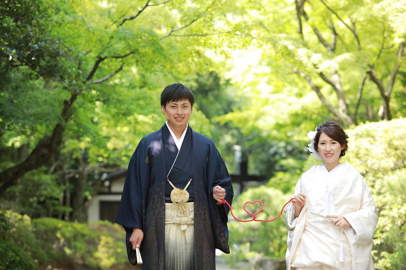 選ばれた新婦様。新郎様は、打掛にあうようにシックな紺の紋付を合わせました。