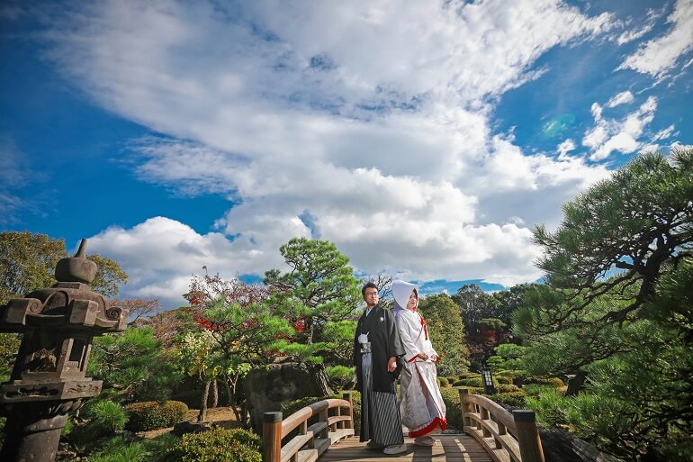 白無垢はかつらに綿帽子と和装ならではの厳粛な雰囲気を。