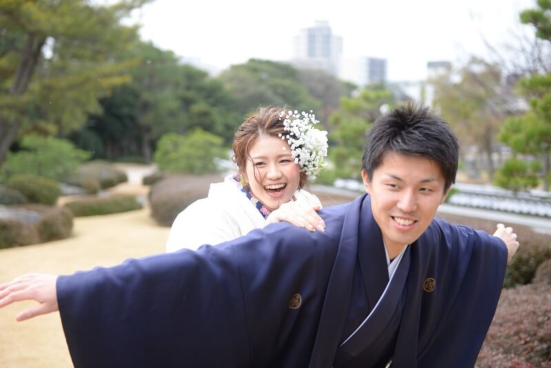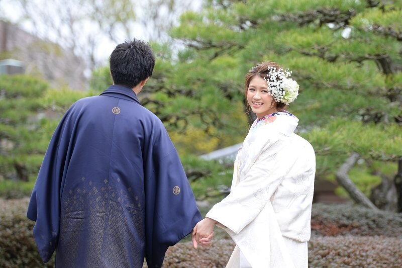 衿と抱帯を新郎様のネイビーと合わせ、統一感を出しました。