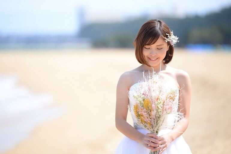 身長が高くスタイルの良い新郎さま、小柄で可愛らしい新婦さま。