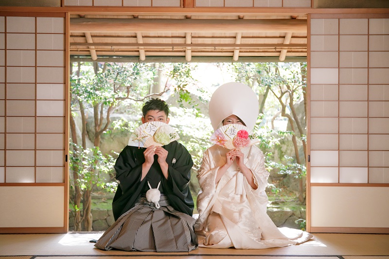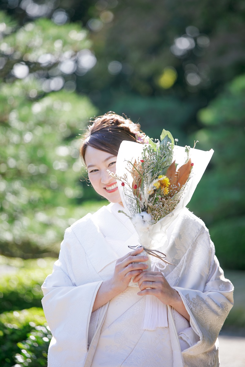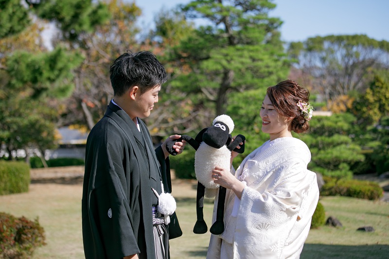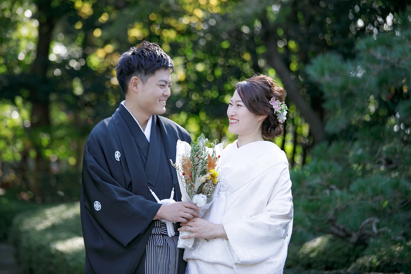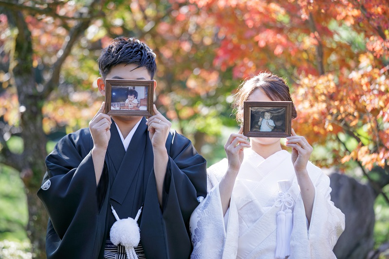 普段からおしゃれなお二人。黒紋付と白無垢に綿帽子でしっかり和の雰囲気を残しながらも、小さい頃のお写真を持って撮影したりとお二人らしい前撮りとなりました。
