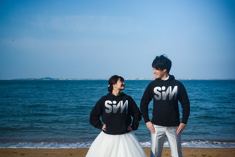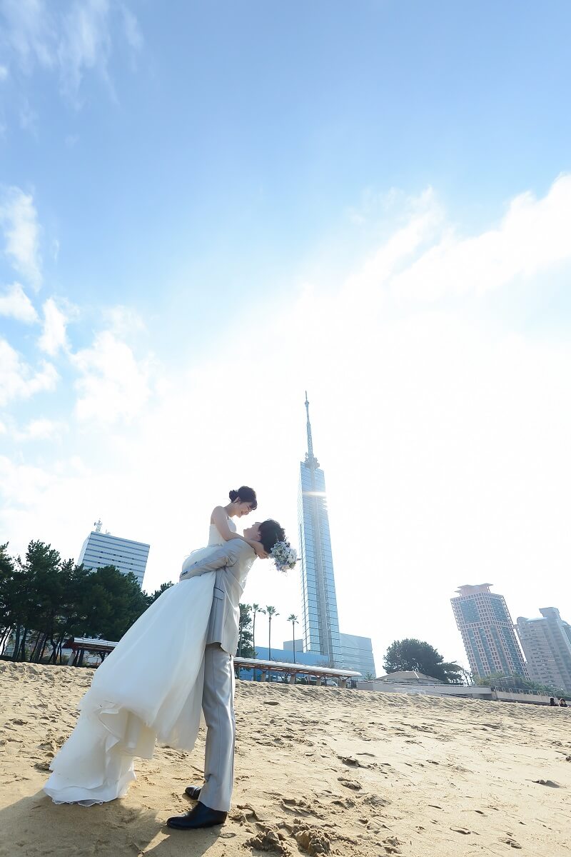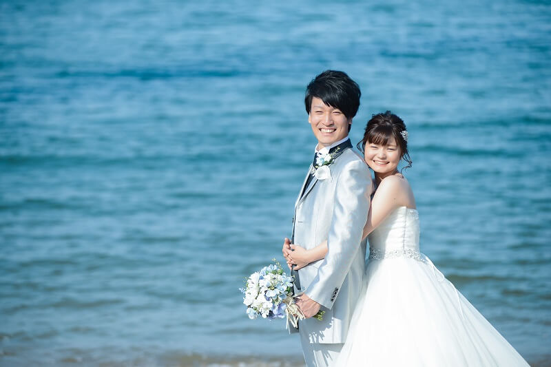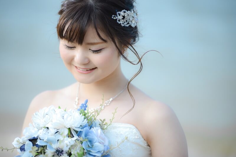 可愛らしい雰囲気の新婦様にとてもお似合いなプリンセスラインのドレスに、海と相性の良いブルーのブーケをコーディネート。
