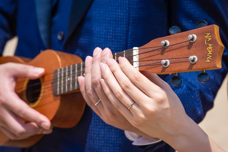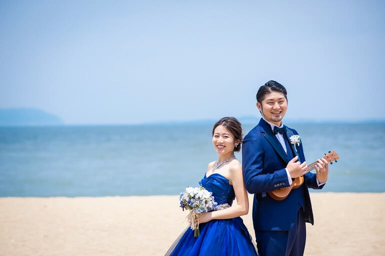 ネイビーのタキシードとドレスで統一感を出し、