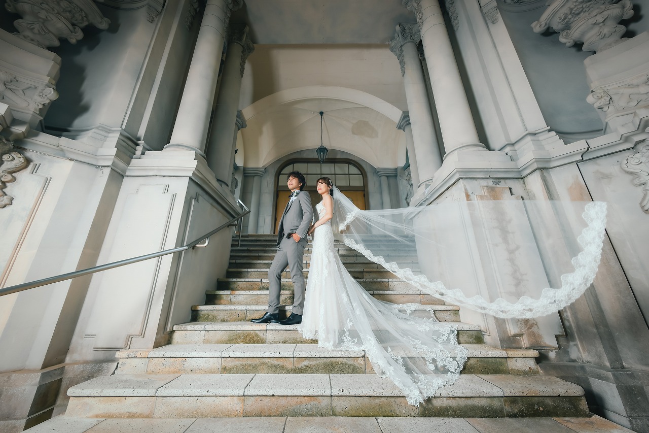 石造りの階段でドレスのトレーンとロングベールを生かしたショット。