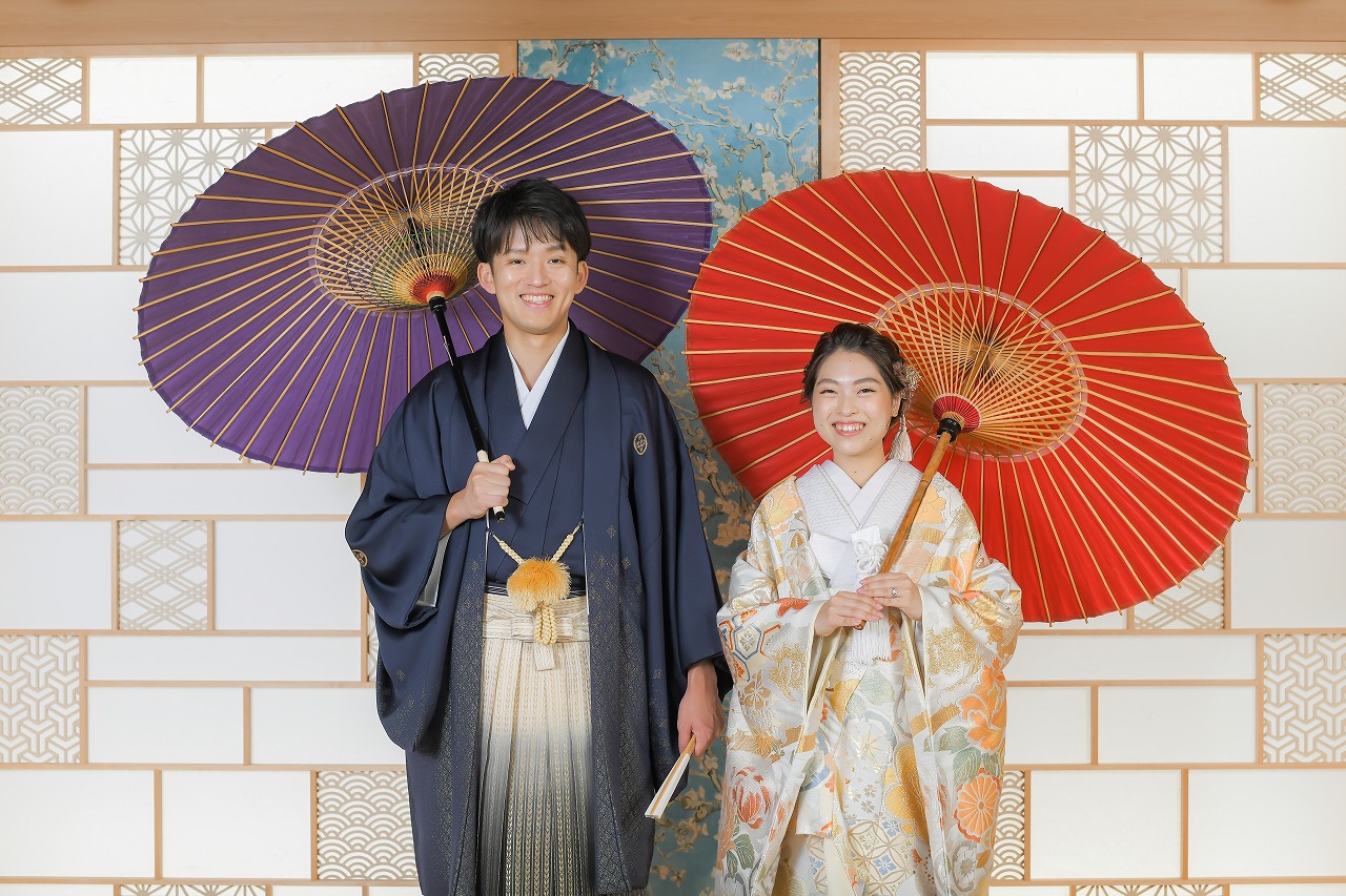 リズウェディングでは、和装撮影にはかかせない番傘のレンタルもオプション料金なしでレンタルができます。