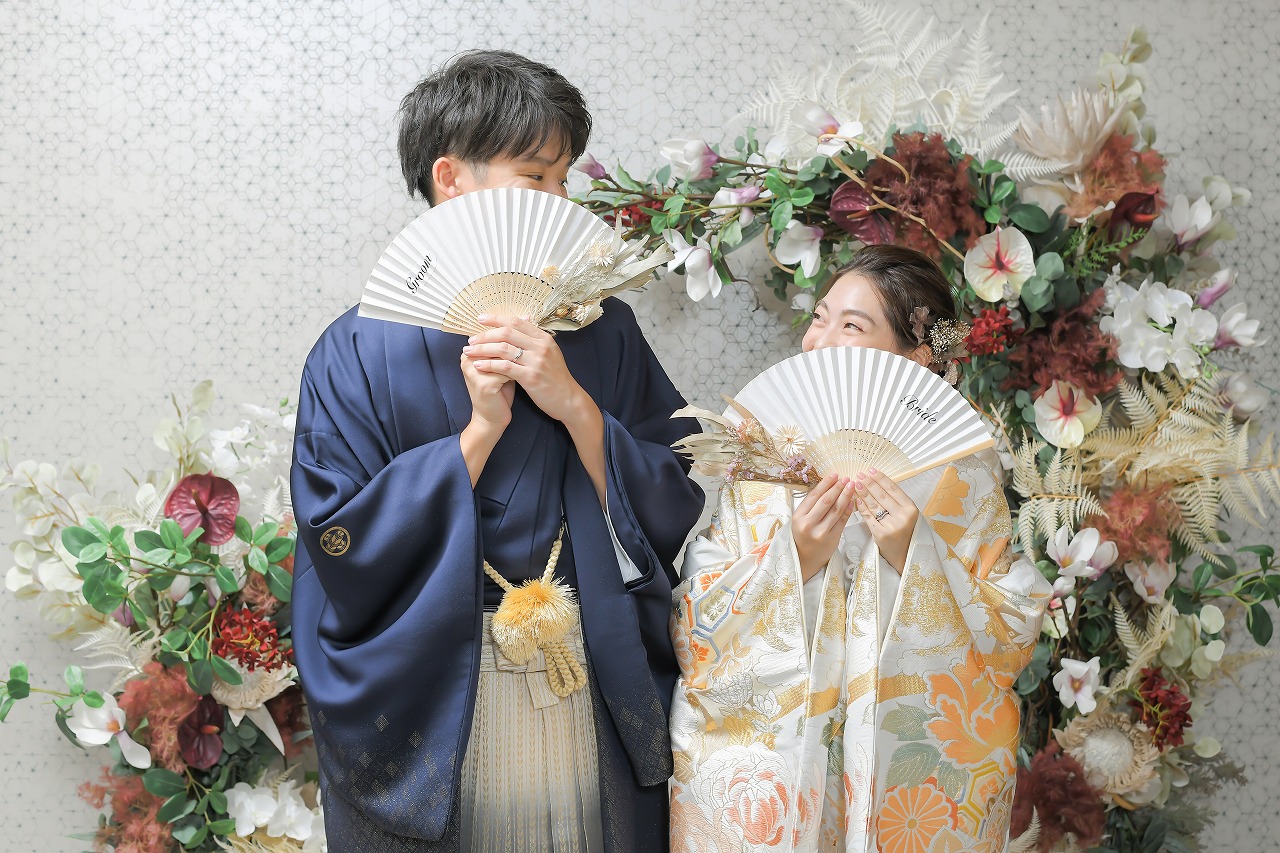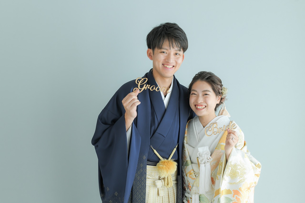 新婦様のお衣裳1点につき、3つまで撮影小物をお持込みいただけます。シンプルな背景をバックに、さりげなくお二人らしさを演出しました。