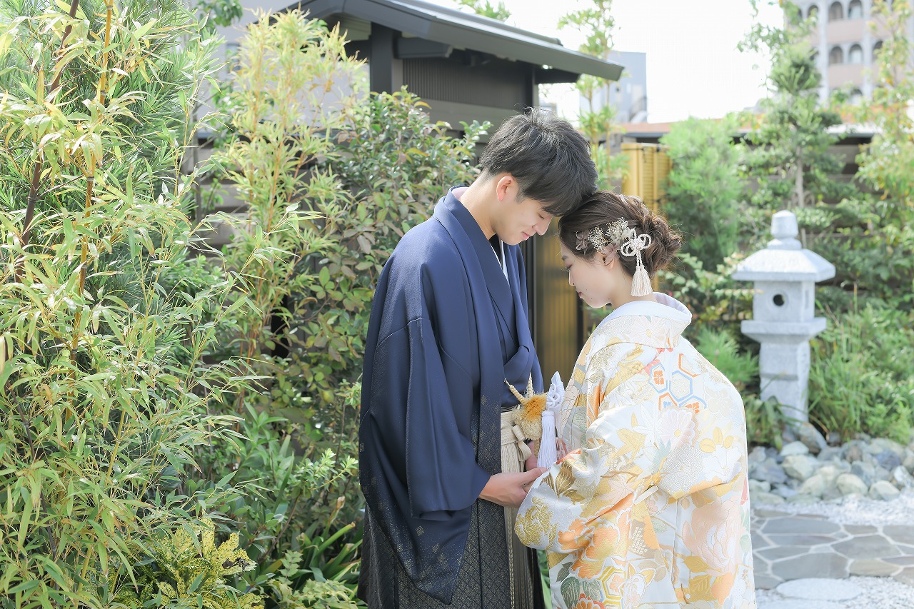 屋上庭園の片隅にはグリーンバックでの撮影スポットもございます。色打掛の淡いお色味がよく映えている一枚となりました。